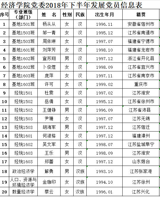 根据《发展党员工作实施细则》有关规定,经学院基层党支部考察、学院党委预审,拟接收杨丛丛等20名同志为中共预备党员。现将名单予以公示: