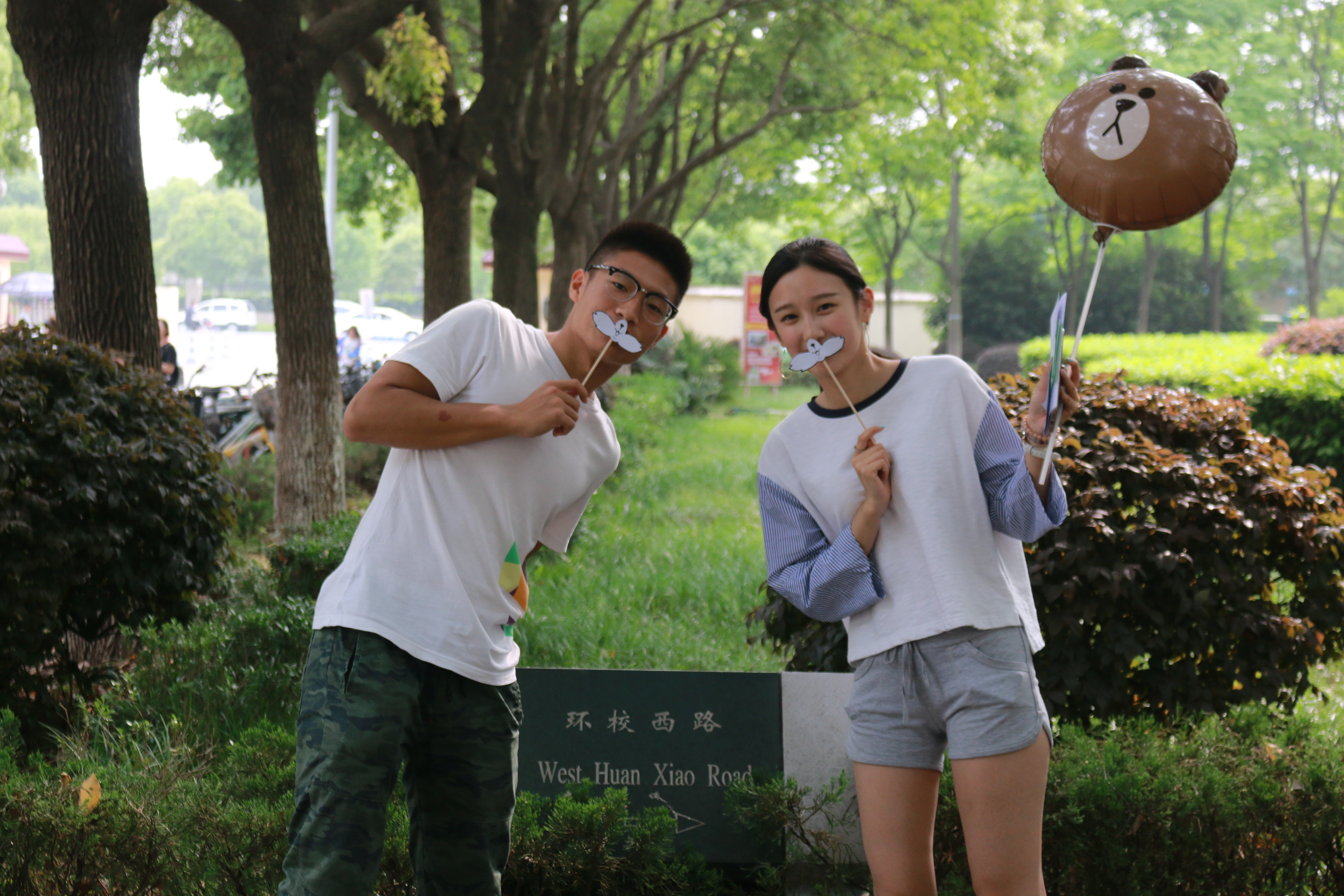 夏日西斜,花香熏醉。同学们在活动帐篷前有序地领取任务卡和兔唇道具。同学们找来食堂阿姨、外国友人、保安大哥、陌生同学等人合影留恋,还有些同学需要与校内第111号路灯下、环校西路路标等地标合影拍照。
