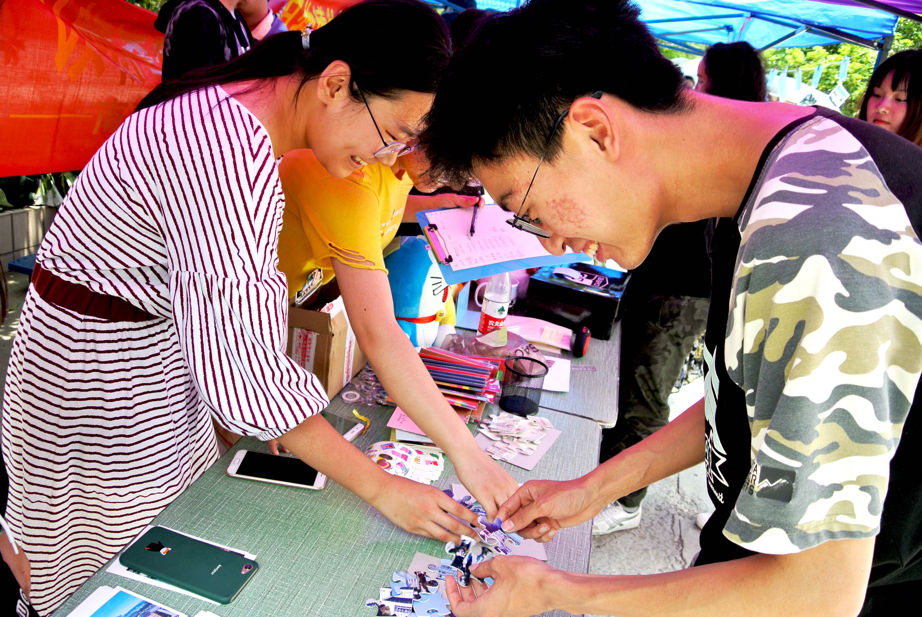 活动现场,路过的同学积极参与其中。有的在认真聆听工作人员的讲解;有的仔细阅读每一份旧物上面的便利贴,领取想要的物品;有的参与“拼图校园”和“校园建筑名解说”现场游戏,解读校园建筑物的含义……王同学领到大四学长的存钱罐,激动地表示:“希望我能带着学长的心意,填满存钱罐,带着它去旅行。”