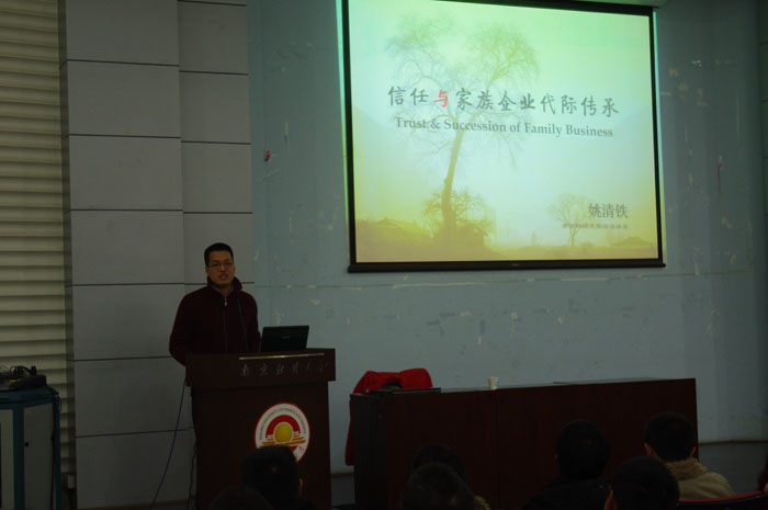 12月8日晚,星空官网“未来之路”学术讲坛第二期在专一报告厅成功举办。本期主题为“信任与家族企业代际传承”,主讲嘉宾为星空官网姚清铁老师。姚老师以他独具魅力的讲授方式,将信任在家族企业代际传承中的重要性讲述的深刻、清晰,带领全场听众领略了跨国界、跨时代的家族企业风采,探讨了古老家族企业的长寿之道。