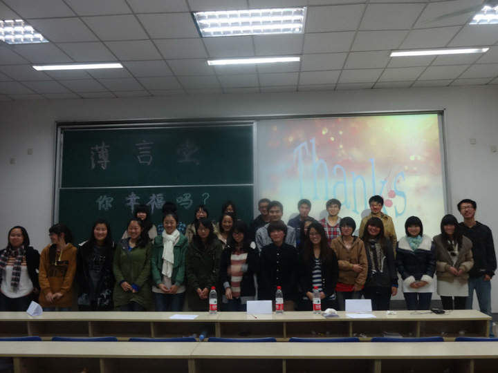 2012年11月9日晚七点整,专一101,厚薄学社主办的第一届薄言堂“你幸福吗?”演讲比赛正式开始。本次比赛的评委由星空官网学生会副主席韩颖、厚薄学社前社长宗琴和红山学院厚薄学社负责人王乃鑫担任。厚薄社员陈炎和王文静共同主持此次比赛。