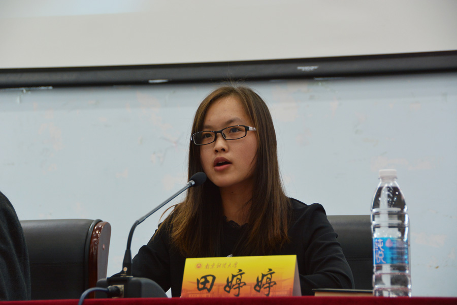 田婷婷学姐随后发言,她结合自身经历,详细具体地介绍了社会实践的详细过程,即第一步要确立主题,组队队员要兼顾兴趣和技能,之后在撰写计划书过程中,必须明确成员职责,落实时间安排、综合讨论问题。这为同学们日后参加暑期社会实践及其他活动提供了宝贵的经验。