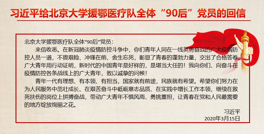 为引导青年学生深入学习领会习近平总书记给北京大学援鄂医疗队全体“90后”党员的回信精神,3月25日,院党委副书记袁怡琨通过腾讯会议为XK星空体育学生党员及学生干部讲授院级信仰公开课“以实际行动践行青年的担当和使命——学习习近平总书记给北京大学援鄂医疗队全体“90后”党员的回信精神”。袁书记说:习近平总书记的回信言简意赅,充分肯定了广大青年在疫情防控斗争中彰显的青春力量、作出的积极贡献,体现出总书记对新时代广大青年的殷切期望。同学们应该凝聚思想共识,增强与祖国同命运共奋进的责任感和使命感。同学们纷纷表示将会立足岗位,勤于学习,勇于实践,把最美好的青春献给祖国和人民,谱写壮丽的青春之歌。
