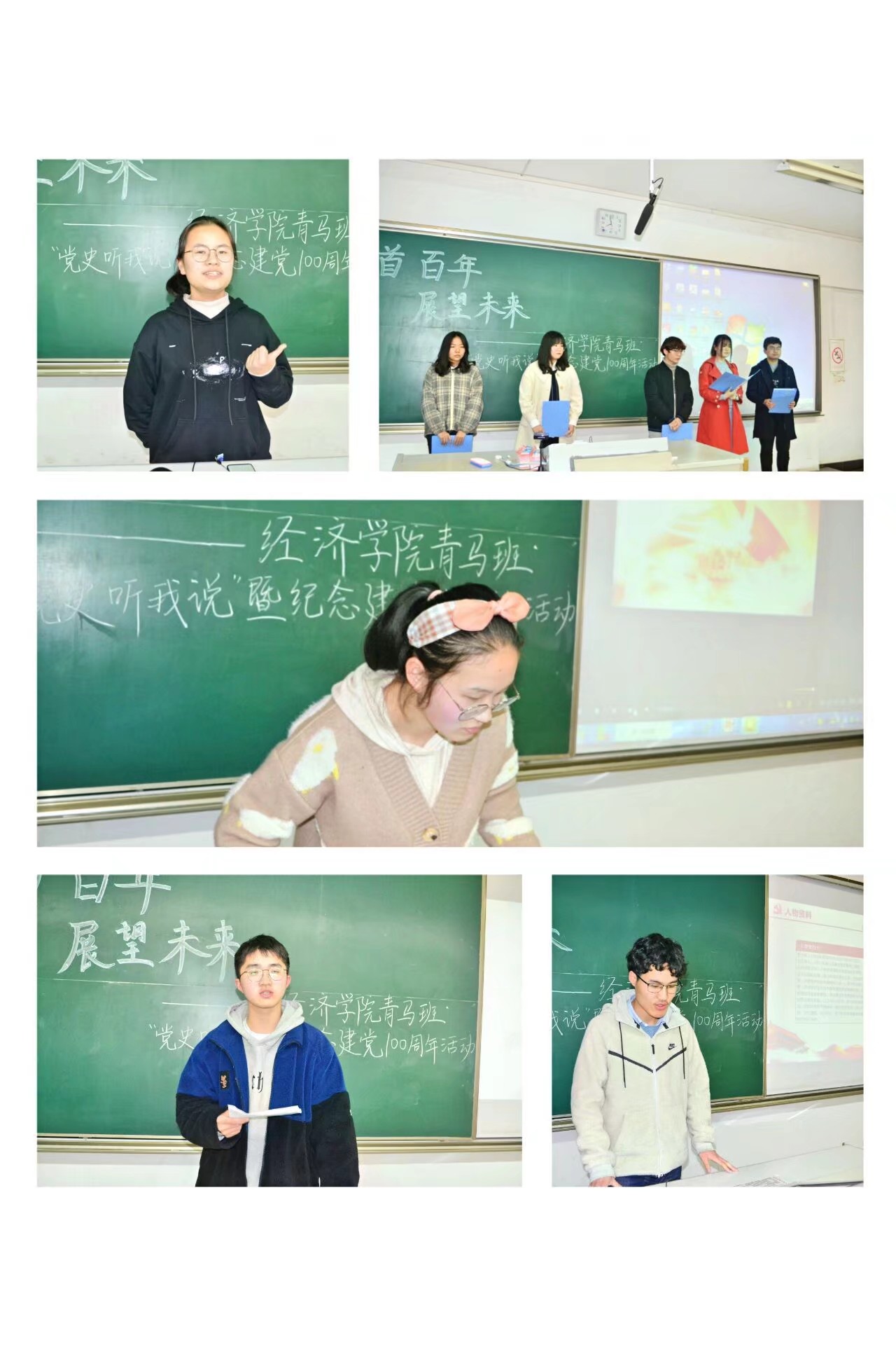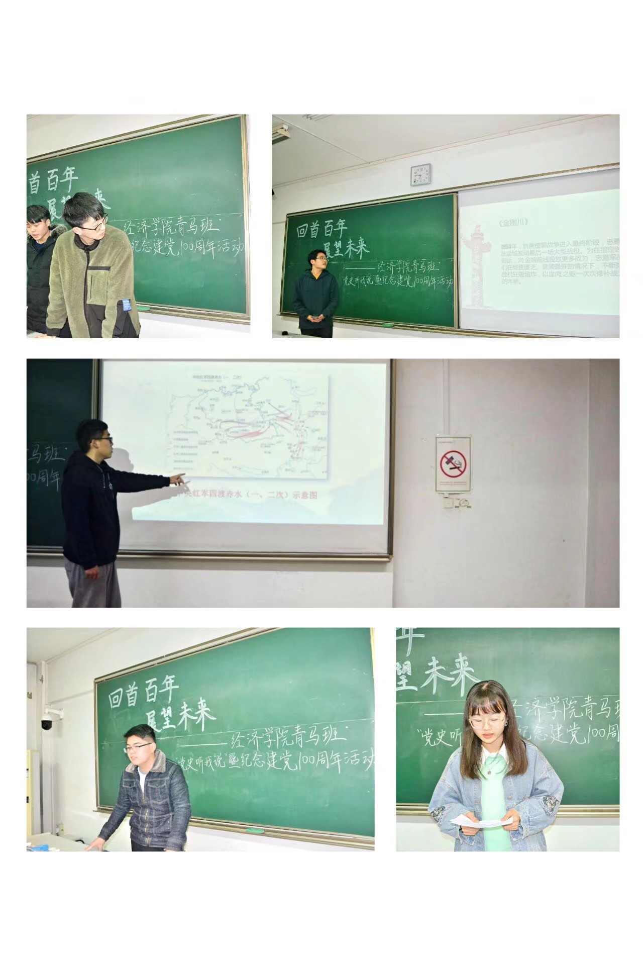活动分为三部分,首先,青马班学员们以主人翁视角,选取典型事件,再叙我党成长之路。“腹有青马气自华”小组朗诵和PPT演讲结合,介绍了娄山关之战。“青梅竹马”小组介绍了抗美援朝战役,讲述了自己对未来的展望。“人民当家作主”小组演讲人就图片地形展示生动再现中印边境自卫反击战庞国兴小组战斗过程。“力拔山兮气盖世”小组以长征精神为主题,配上激昂的背景音乐,感染了在座学员。“青马学习”小组以视频剪辑电影《建军大业》再述南昌起义。“名字好难起”小组就革命战士卢德铭个人生平,传递革命精神。“卧龙”小组回顾百年历史,以诗朗诵和《中国机长》情景表演,赞颂了彭德怀、周恩来、邓小平、刘传健四位伟人。“爱国敬业诚信友善”小组讲述了李大钊在党发展中的作用。“好家伙针不戳”小组从计划经济时代中国到改革开放、大国外交,用自己独特的见解娓娓道来。“马克思主义接班人”小组通过剪辑视频回顾南昌起义,红军长征,新中国成立。