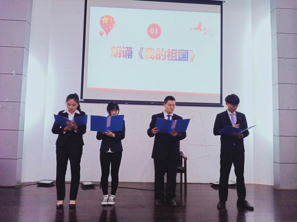 接着,学生会对外交流部社联组带来了诗歌朗诵《我的祖国》。他们用铿锵有力的话语向我们昭示了当代青年对我们伟大祖国的热爱,以及流露出对祖国发展日新月异的自豪感。