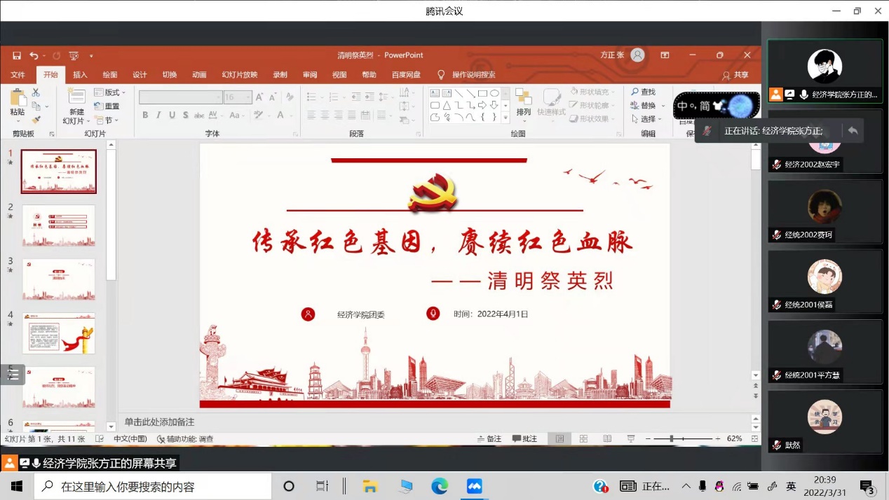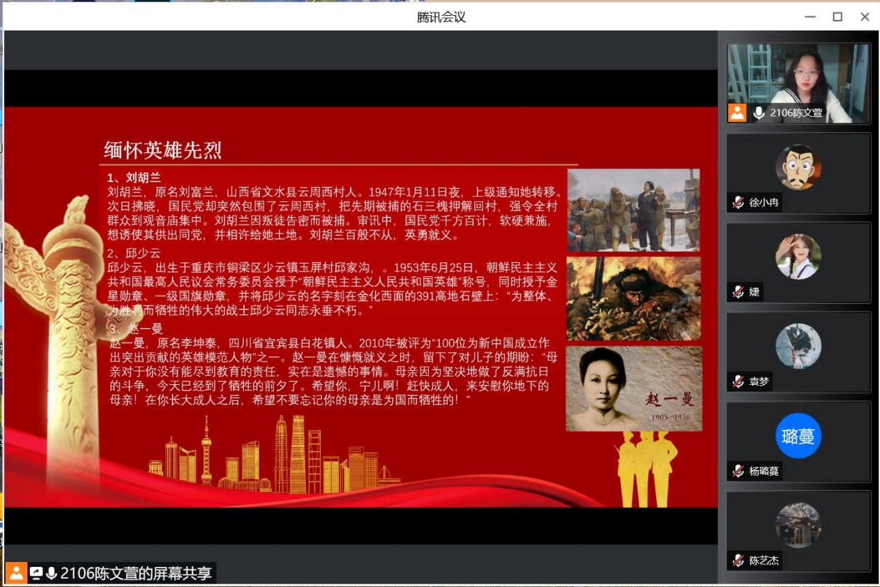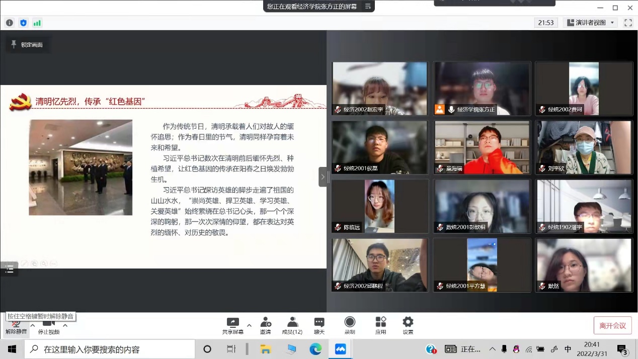 星空官网分团委组织各班以线上团课的形式开展丰富多样的清明祭英烈活动,各团支部通过ppt、视频等形式带领同学们回顾了百年来代代革命先烈赴汤蹈火、矢志不移,用鲜血和生命书写的气吞山河的英雄史诗。经济2106班团支部以侵华日军南京大屠杀遇难同胞纪念馆为背景展开了对南京历史的追忆,着重介绍了南京大屠杀中为保卫民族英勇斗争的抗日英雄,他们的英烈壮举让许多同学内心动容、眼眶湿润;经济1902班团支书向同学们介绍了在疫情阴霾笼罩下,在疫情战斗的前沿阵地,与病毒抢跑、与死神抢人、勇敢逆行的医护工作者们;数统2001班团支书向同学们介绍了清明节的重要内涵,他说道:“通过此次团课,我认识到清明节不仅是人们祭奠先祖、缅怀先人的节日,也是中华民族认祖归宗的纽带,更是一个远足踏青、亲近自然、催护新生的春季仪式。”团课期间,同学们都神情庄重严肃,认真聆听团支书的介绍与分享,积极参与讨论互动,并在线上为英雄先烈们留言,寄托哀思。同学们纷纷表示此次清明祭英烈活动,让他们走进历史,走近英雄先烈们,明白了现在生活的来之不易,更懂得了作为新时代青年所肩负的历史责任和使命担当。
