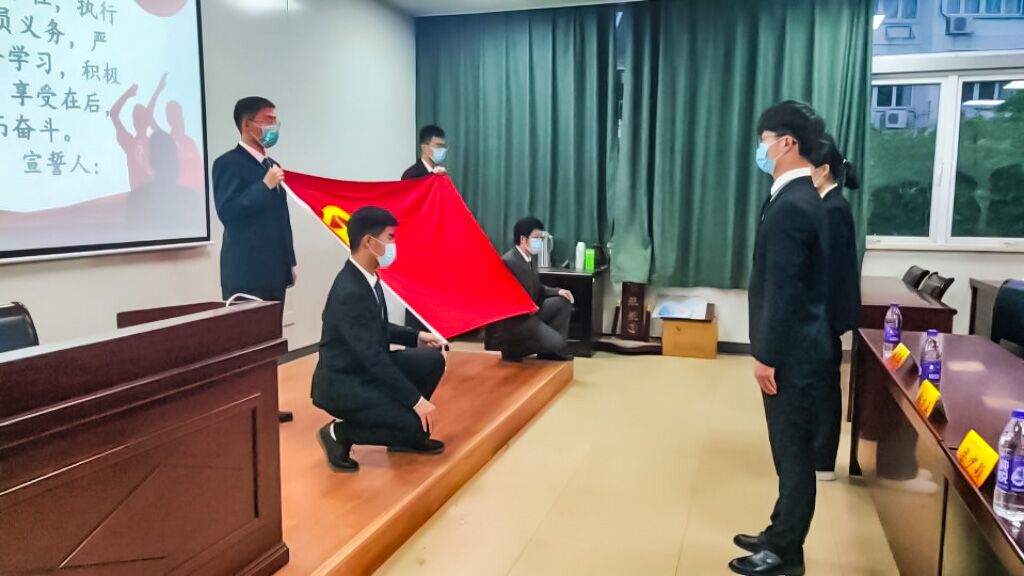 活动在雄壮的国歌声中拉开序幕,主持人徐宇恒宣读了2022年新发展团员名单,并对入团仪式的意义作出诠释。主持人指出,五四青年节源于1919年5月4日以青年学生为代表的爱国运动,青年意味着责任,入团则意味着带头尽责,每一位青年团员都应铭记先辈们用青春和热血谱写而成的伟大征程,立志成为一名合格的优秀的共青团员。随后,星空官网分团委书记潘怡老师来到台前,将团章与团员证郑重递与两位新团员,并亲自为他们佩戴好团徽。紧接着,分团委副书记张方正带领大家进行入团宣誓,两位新团员语气满是坚定、誓言饱含热情,他们所佩戴的团徽在他们的胸前闪闪发光,共青团员的担当与责任也从此在他们心中闪耀。