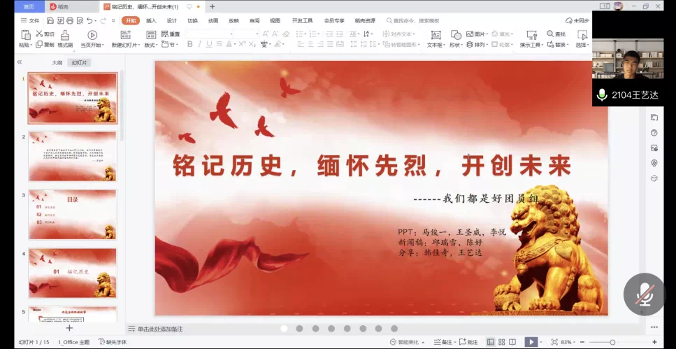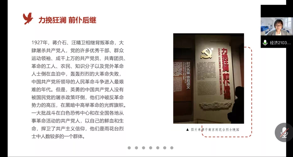 在主持人的引导下,两个班的各个小组均进行了精彩的分享。在云参观雨花台烈士纪念馆并回顾了我党发展历史后,每一位青马班的学员都受到了一次深刻的思想教育和精神洗礼。学员们将自身的所思所感制作成PPT与大家进行交流。分享过程中,学员们为曾经的历史所动容,认识到了如今我们幸福生活的来之不易,纷纷表示在今后的学习生活中将更加严于律己,争做合格的时代新人。