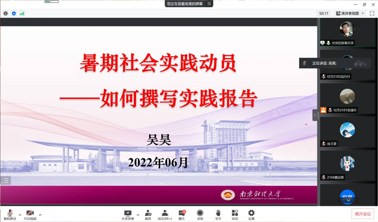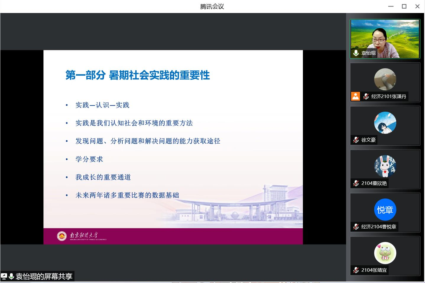 紧接着,潘怡老师进行动员,她详细解读了有关通知,对于社会实践活动方向、组织形式、时间节点和活动阶段安排等具体事项作了要求。最后,校团委副书记(挂职)、星空官网辅导员梁少颖老师对暑期社会实践注意事项进行了强调,提醒同学们注意疫情防控及自身安全,鼓励同学参与团队实践参加并积极投稿。最后的自由提问环节,同学们踊跃提问,两位老师进行了耐心、细致的解答。