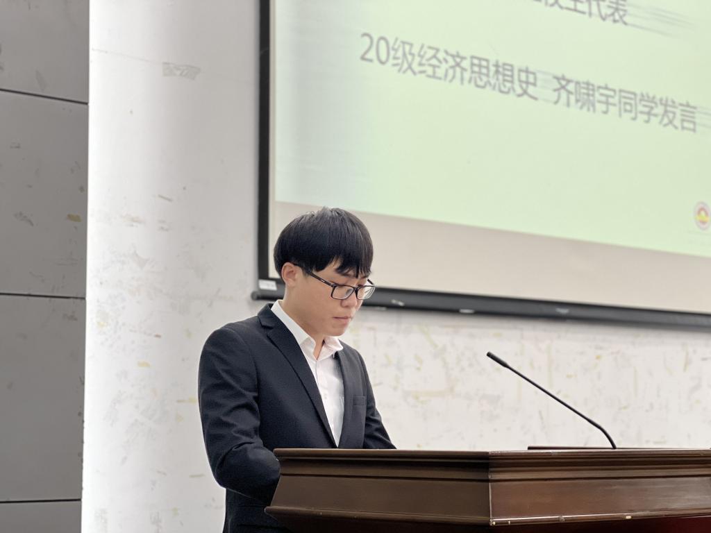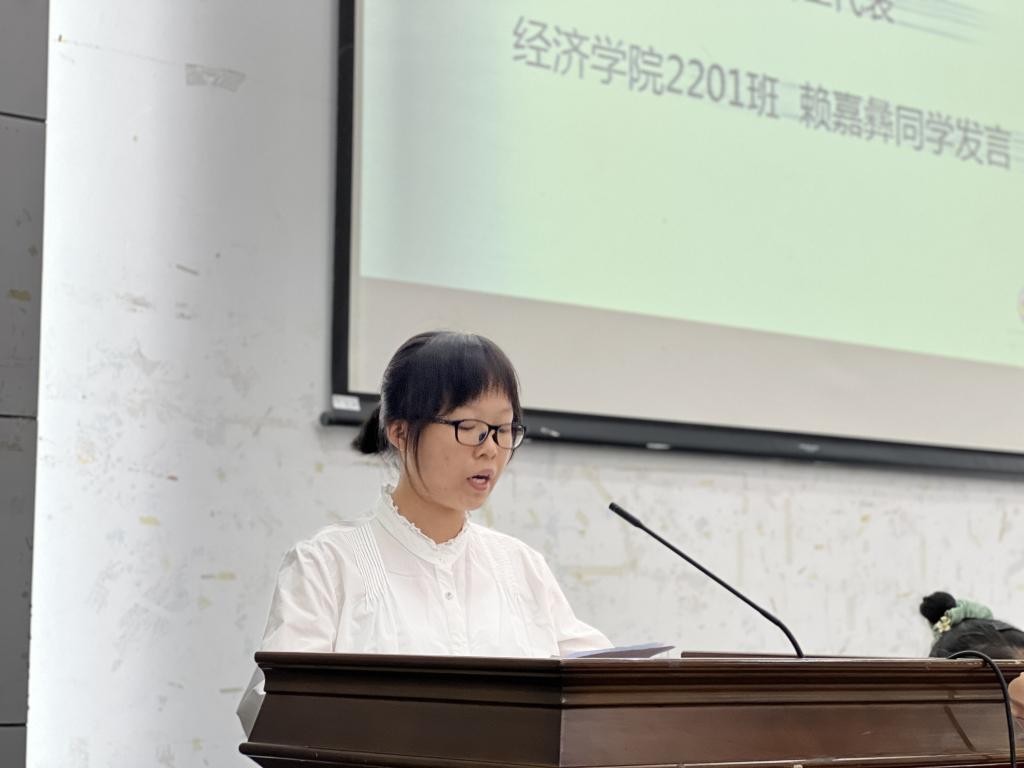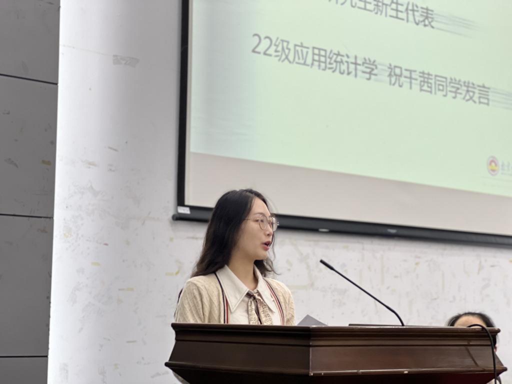 本科生在校生代表数统2001班桑海瑞从学校、学院、专业和生涯发展等四个方面和新生分享应如何度过大学四年。研究生在校生代表2020级经济思想史专业齐啸宇以南财校训与全体新生共勉,希望大家能在星空XK的沃土中,练就出过硬的本领,创造出更加辉煌的明天。本科生新生代表2201班赖嘉彝号召全体新生珍惜时光,把握机会,且行且思,不驰于空想,不骛于虚声。在对专业的潜心学习中,掌握知识,播种热爱,收获喜悦,不坠青云之志,永存赤子之心。研究生新生代表2022级应用统计专业祝千茜从自主性和创新性两个方面表达了对研究生阶段的向往和期待,希望在新的求学之路上活出卓越与非凡、充实与精彩。