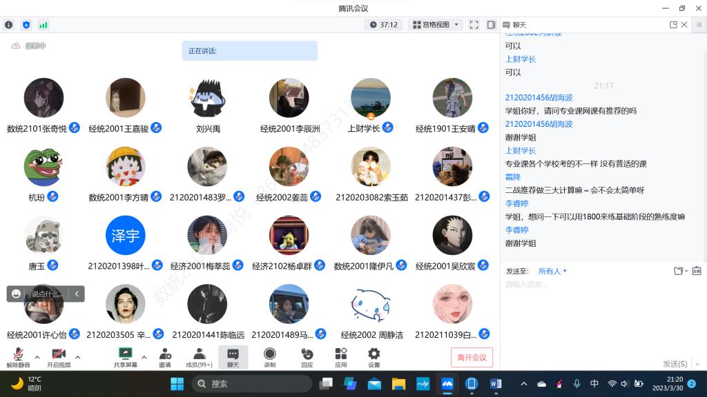 王安晴同学首先从统计学考研的专业选择陈述,强调要结合自身情况选择考研学校以及选定考研学校以后要进行目标院校信息搜寻。随后,她从政治、英语、数学和专业课四个考试科目分别说明每个学科的学习内容以及什么时候开始学习比较合适。对于政治,她建议以做题、背诵为主,网课为辅,并注意重要知识点的梳理;英语方面的学习,应注意背记单词的重要性,日常积累模板和素材;对于数学科目的学习,王安晴同学将其分为基础、强化和后期学习三个阶段,她给出了每个阶段该如何学习的具体方法,说明了提升计算能力的重要性;关于专业课的学习,她强调应尽早学习,尤其应注意目标院校考试内容,明确考试范围、题型和出题风格,搜集历年真题,特别注意简答题的分数占比与背诵。此外,王安晴同学还提示大家应注意整个备考过程中调整心态,坚定目标,勤奋努力,不要过分焦虑,相信努力的重要性,更不要美化未选择的道路,走好自己脚下的这条路才是最重要的。