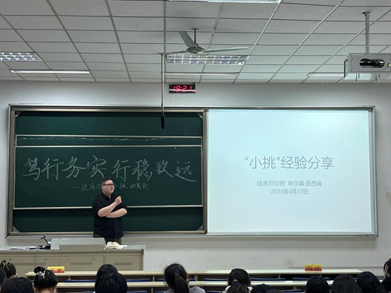 随后,叶尔森·吾西肯同学为大家做经验分享。叶尔森同学曾参与“挑战杯”“互联网+”等创新创业赛事,获得国家级、省级和校级奖项若干。他从团队的组建、项目选择和商业模式逻辑的选择等方面,进一步向同学们梳理了参加“挑战杯”中国大学生创业计划竞赛的几个重要流程。他还讲述了怎样设计答辩PPT、怎样选择团队答辩代表、在答辩时遇到评委提问超出准备范围时如何给出更好的回答等,让同学们认识到“挑战杯”中国大学生创业计划竞赛的严谨性与专业性。他强调,竞赛获奖的前提是合理的项目、高效的团队和用心的准备。