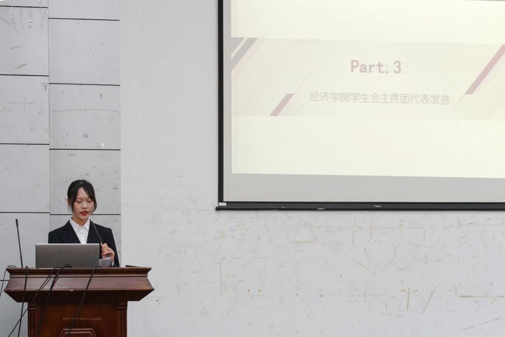 大会上,党委副书记贾亦璞老师发表致辞。她代表学院对2023级新生表示最衷心的祝贺与最热烈的欢迎,并通过“三个色”向全体新生提出了三点嘱托:一是用爱国和信仰照耀生命本色;二是用吃苦和奋斗铸就生命底色;三是用梦想和行动点亮生命亮色。“大鹏一日同风起,扶摇直上九万里”,她希望同学们能够借助学院提供的广阔平台,乘势而上、踔厉奋发、不懈努力,筑牢经济学科基础,谱写新的篇章。
