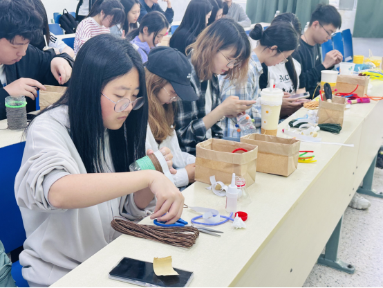 在随后的“瓶空再造”环节中,同学们利用废旧塑料瓶,充分发挥想象进行再利用。有人用彩带编织出美丽的花环,为空瓶穿上华丽的礼服,有人用贴纸创作出独特的图案,帮助空瓶焕发新的生机,还有人将一颗颗珠子串起,为空瓶打造独特的项链。同学们大胆构思设计,创作出了独一无二的花瓶。