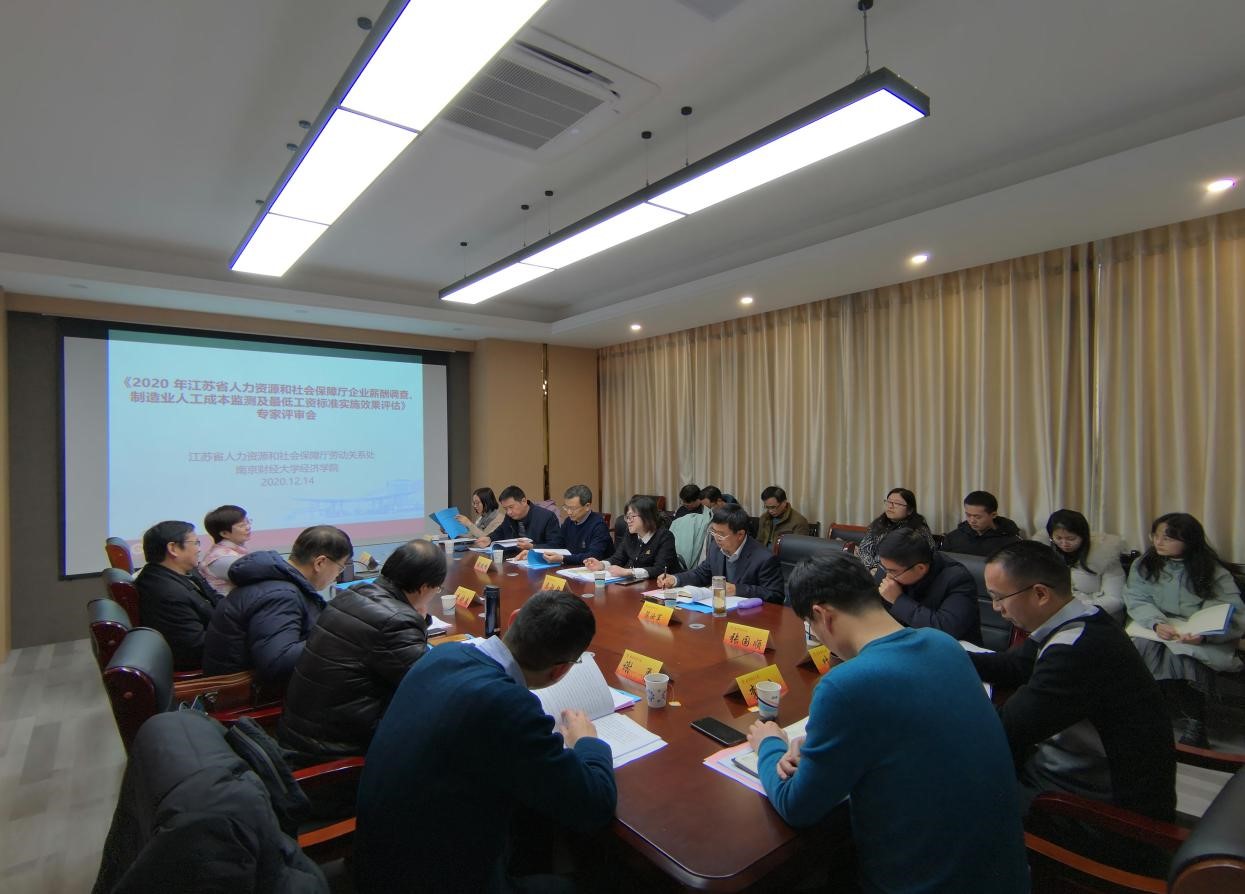 12月14日下午,由江苏省人力资源和社会保障厅委托我校XK星空体育组织研究的《2020年江苏省人力资源和社会保障厅企业薪酬调查、制造业人工成本监测及最低工资标准实施效果》项目成果在XK星空体育学术报告厅组织评审。省人社厅劳动关系处、规划财务处、农民工工作处领导参加了评审会。与会专家南京大学XK星空体育李晓春教授、东南大学国际经济与贸易系主任刘修岩教授、南京农业大学公共管理学院谢勇教授、我校科研处副处长杜修立副教授、XK星空体育副院长尹敬东教授等校内外专家对项目进行了评审。课题组主要成员参加了会议。