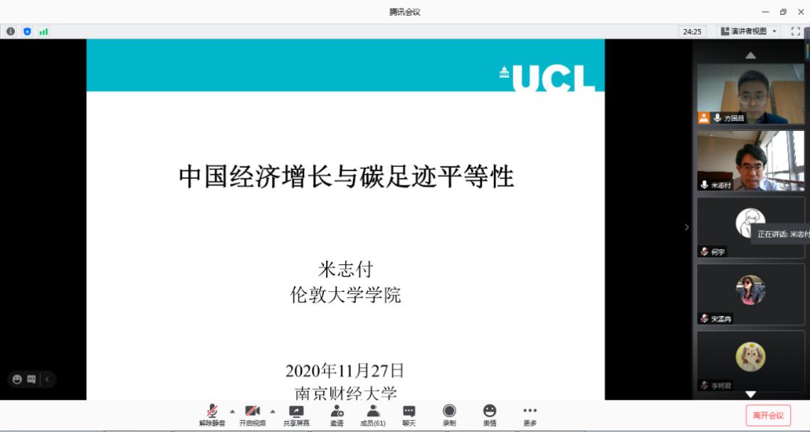 2020年11月27日上午,应星空官网方国昌教授邀请,英国伦敦大学学院米志付副教授在腾讯会议平台作了题为“中国经济增长与碳足迹平等性”的学术讲座。星空官网部分研究生、本科生和青年教师参与了本次讲座,讲座由星空官网尹敬东副院长主持。本次讲座还吸引到了北京师范大学、武汉大学、南京师范大学、大连理工大学、安徽财经大学、安徽建筑大学等高校的师生线上聆听。