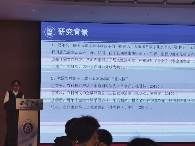 李庆海副教授受会议组织方邀请,就数字普惠金融的专题论文汇报进行了点评。徐闻怡同学在论坛汇报了《金融知识有助于农村居民识别金融诈骗吗?》一文。文中指出金融知识有助于农户识别金融诈骗,社会互动、适度的信息关注和主观幸福感更有助于金融知识作用的发挥,在不同类型金融诈骗的作用中,金融知识对识别的影响在电信诈骗、网络诈骗和传统诈骗中显著。该文引起了与会者的普遍关注和重视,并最终从近百篇论文中脱颖而出,获得优秀论文三等奖。