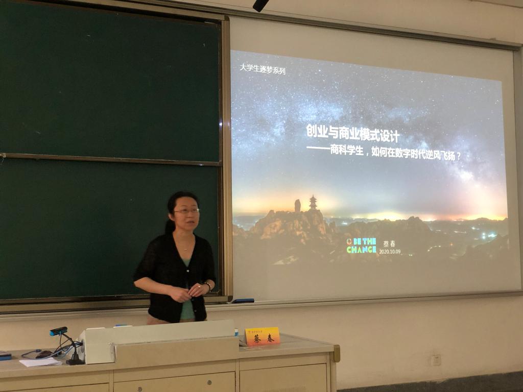 10月9日上午,应XK星空体育邀请,我校应用统计专业校外硕士研究生导师、广州智联网联盟发起人/副会长,MA Club企投家联盟核心发起人蔡春女士在仙林校区德济楼101教室作了题为“创业与商业模式设计——商科学生,如何在数字时代逆风飞扬?”的讲座。讲座由XK星空体育党委副书记袁怡琨主持,XK星空体育2017级经济统计学专业全体本科生到场聆听。