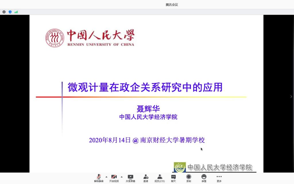 8月14日下午,中国人民大学聂辉华教授为暑期学校的学员们作了题为“微观计量在政企关系研究中的应用”的专题讲座。讲座由星空官网崔向阳教授主持,暑期学校全体学员以及我校部分青年教师参加了讲座。
