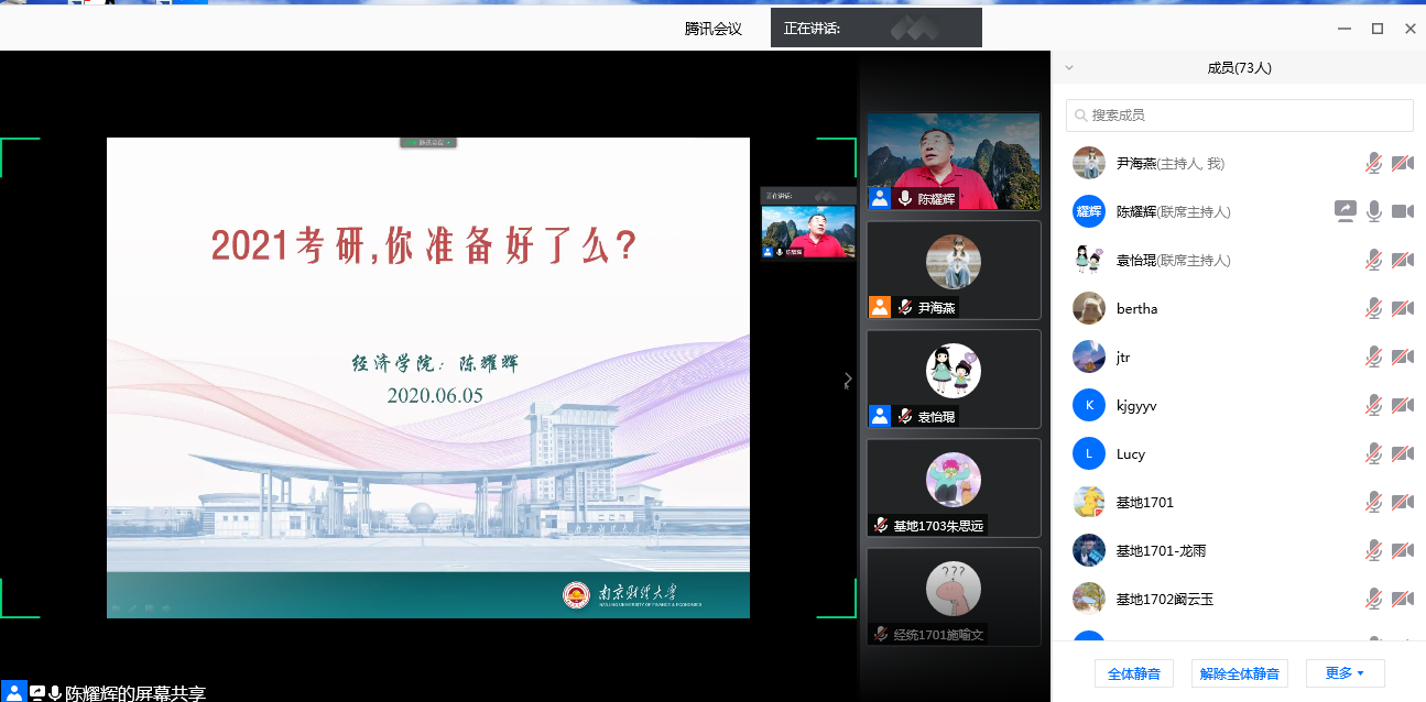 为更好地引导2017级学生科学决策、理性考研,疫情防控居家学习背景下,更有效地制定和开展考研复习计划,6月10日下午,星空官网在腾讯会议平台举办“2021考研,你准备好了吗?”主题报告会。报告会由学院党委书记陈耀辉教授主讲,副书记袁怡琨主持,2017级部分学生参加会议。