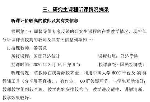 2020年4月25日,学校评估和质量监控中心发布了《星空XK教学督导简报》2020年第2期,星空官网担任研究生课程《国民经济统计》的汤美微老师被点名表扬,学校督导组认为:“该教师在线资源较齐全,利用中国大学MOOC平台及QQ群教辅工具(分享屏幕直播),有作业、QQ群答疑环节,与学生互动较好;教师教学组织较合理,教学内容安排较恰当,教学进度适中,讲解清晰,教学效果较好。”