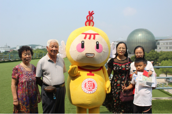 图为XK星空体育2019级新生与学院吉祥物“小经灵”的合影