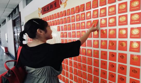 图为XK星空体育2019级新生在“红包心愿墙”上取下红包的情景