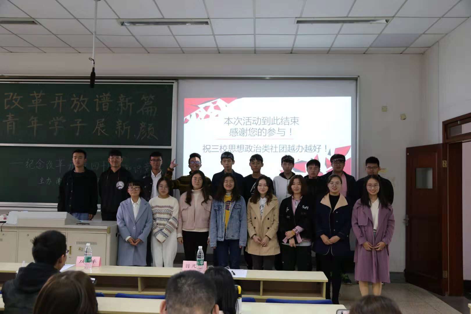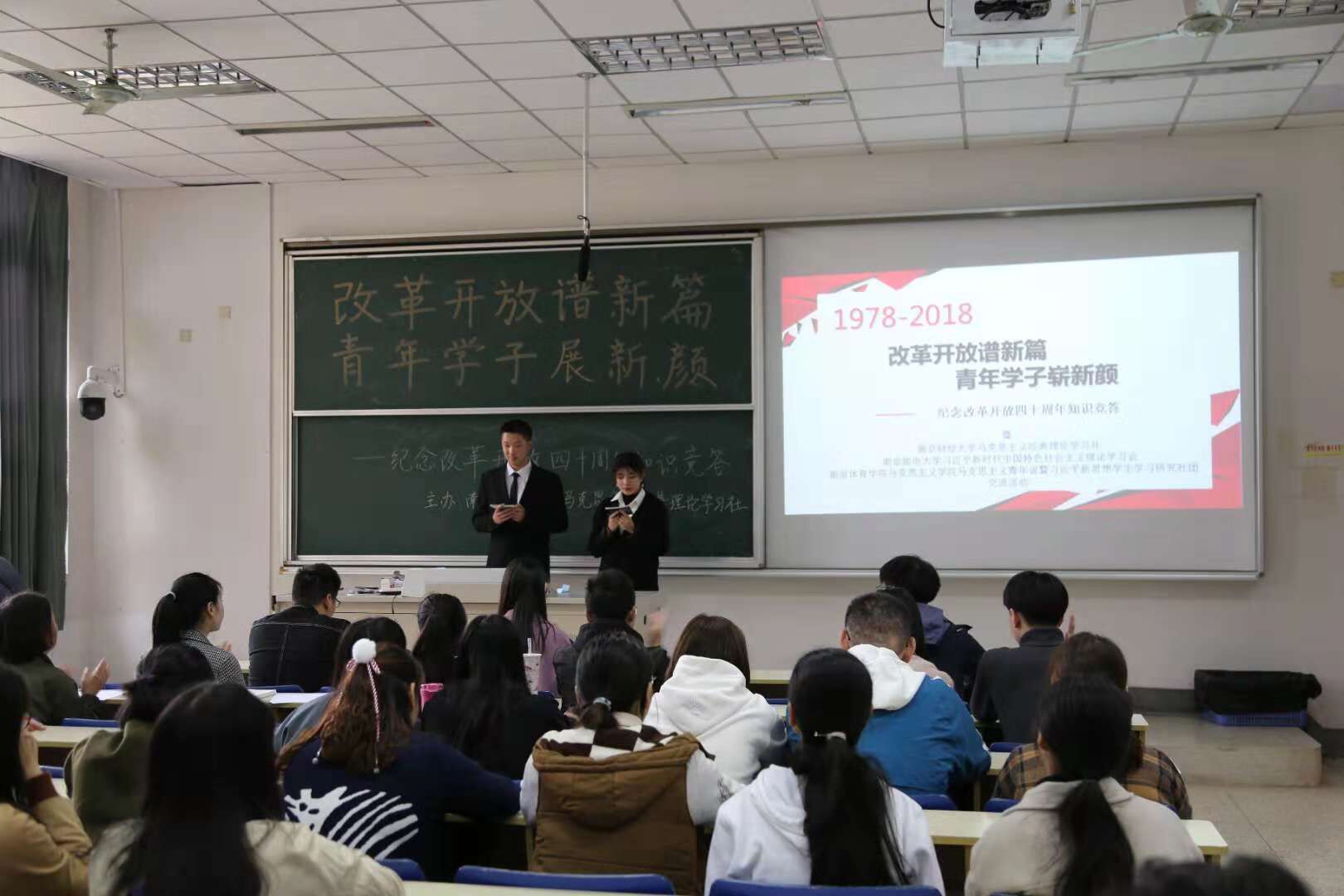 11月11日下午,星空官网马克思主义经典理论学习社联合南京邮电大学习近平新时代中国特色社会主义思想学习会、南京体育学院习近平新思想学生学习研究社,在德经楼101举行了“改革开放谱新篇,青年学子展新颜”——庆祝改革开放四十周年知识竞答活动,星空官网党员、入党积极分子们到场观看了比赛。 活动正式开始前,星空官网马克思主义学社社长庞萍、南邮习学会会长吴忧、南体马院新思想研习社团社长翁凡棋依次进行了发言。首先,庞萍同学以主办方身份对来自南邮、南体的社团同仁们表示了热烈的欢迎和衷心的感谢,同时对此次知识竞答活动提出了要求和期望,并表示希望今后加强三校思想政治类社团的交流与合作。吴忧同学对社团的未来发展方向提出了热切展望,翁凡棋同学则表示希望加强社团间的联系并欢迎兄弟院校社团去南体进行交流。 本次庆祝改革开放四十周年知识竞答活动分为必答题、抢答题和风险题三个环节。选手们一个个你追我赶、不甘示弱,对改革开放四十年的历史都有较好的理解和掌握,场上竞争十分激烈。经过激烈的角逐,南财队获得了卓越青年奖,南邮、南体则分别精神文明奖和思想进步奖。活动最后进行了各队的颁奖和合影环节。 此次改革开放四十周年知识竞答宣扬了改革进取的创新精神,促进了青年学子对相关历史的深入了解,展现了当代青年学子积极向上的精神风貌。