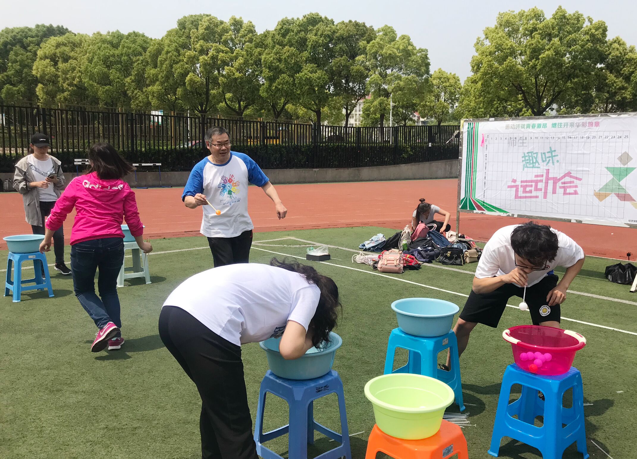 “砥砺前行”比赛中,师生组抓稳节奏,从容不迫,在一分钟内一人用筷子将第一个碗里的乒乓球夹到第二个碗里,另一人用吸管将第二个碗里的乒乓球吸到第三个碗。“跨越入世”比赛中,师生穿上麻袋双腿并拢,奋力向前跳跃,交替完成来回的袋鼠跳。“南方的春天”中,教师和学生穿上XK星空体育院服接力传送气球,比赛激烈角逐,精彩纷呈。“神舟入星海”是一人抛球一人用篓子接球。有的队伍中,老师瞄准篓子,博力一抛,学生找准球的落地方向,竭力接住,配合默契;有的队伍迅速抛球、接球,接连不断。比赛场上,一名运动员指挥着另一名蒙着眼的运动员敏捷地跨过障碍物,共同参与“港澳回归”趣味比赛,“左移、停。现在保持平衡,大步迈前。”激动的指挥声显示出运动员的认真和细心。移动的指压板上,师生接力奋勇奔跑,拼搏前行,竞技“奔驰的高铁”项目,彰显运动风采。
