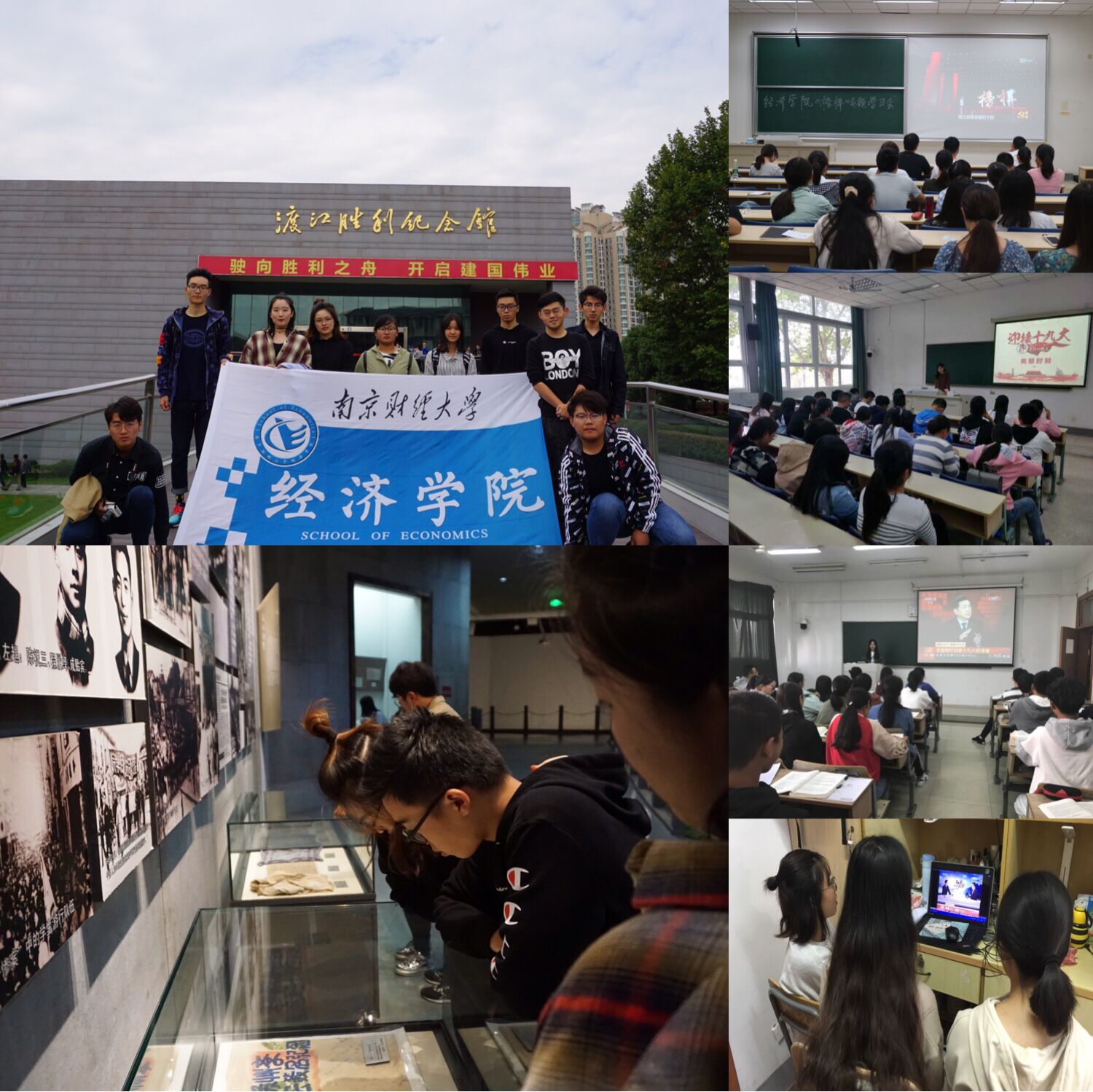 10月10日,星空官网全体师生党支部开展《榜样》专题学习活动,通过观看《榜样》系列纪录片,学习优秀共产党员奉献、坚守、勇于担当的优秀品质。10月13日,星空官网学生组织了“不忘初心,继续前进”南京渡江纪念馆参观活动。渡江胜利纪念馆丰富的展品、生动的展出让同学们深刻体会到战役的残酷与艰辛,体会到先辈面对战斗时的勇敢无畏。10月14-15日,学院各班级开展了形式多样、内容丰富的团支部活动。其中,基地1702班“不忘初心,逐梦前行”主题班会、基地1602班“不忘初心跟党走”讲座、经统1702“青春喜迎十九大”视频展等活动,同学们均积极参与其中,表示将以实际行动和优异成绩向党的十九大献礼。学院分团委副书记吴风清同学表示,通过系列活动,同学们不仅学习到了许多有关党代表大会的知识,汲取了精神养分,更增强了对党和祖国的热爱之情。