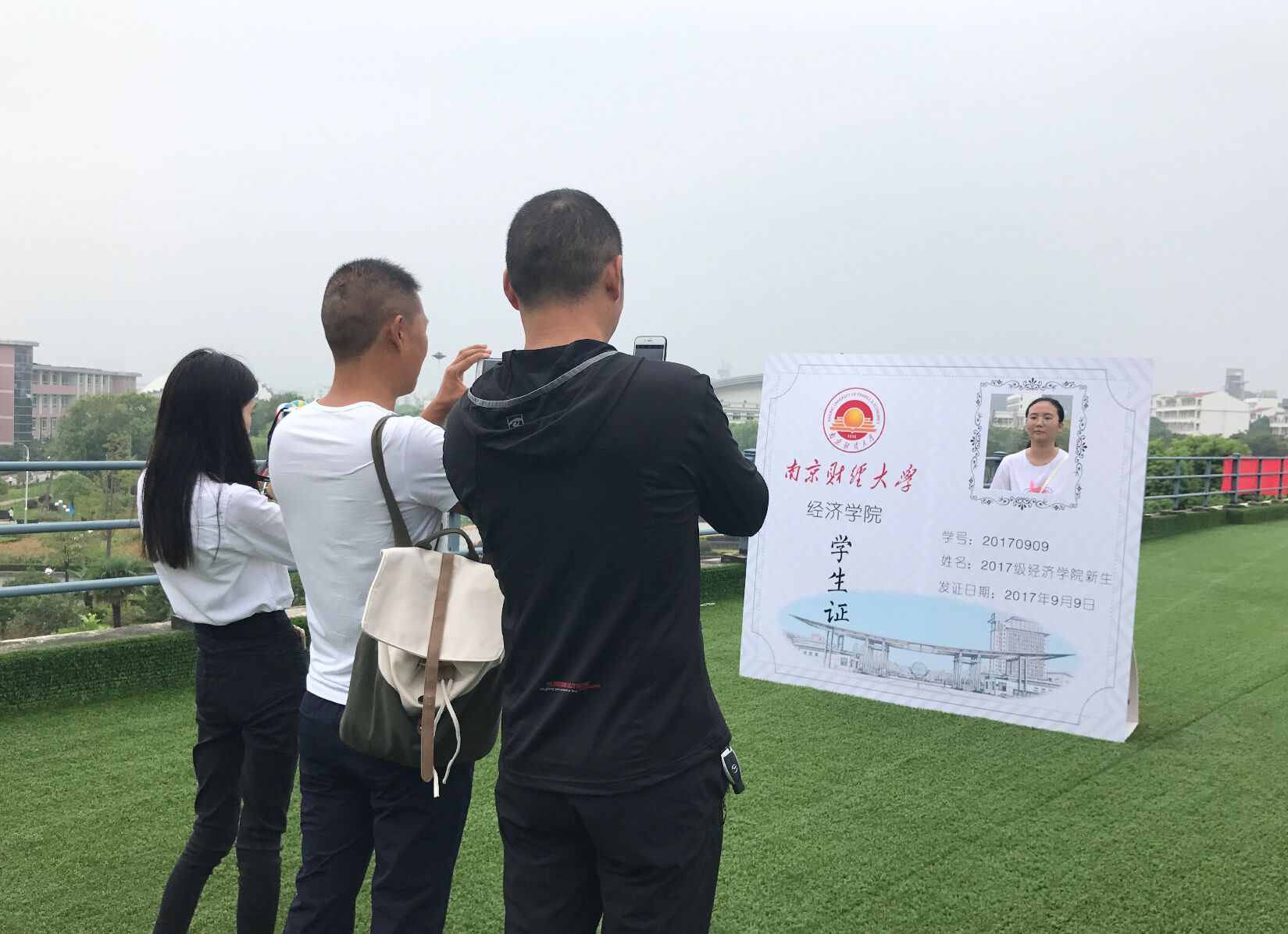 德经楼三楼草坪上,星空官网精心准备了特大号的“学生证”。新同学们以我校图书馆为背景,拍摄了第一张极具纪念意义的大学“学生证”。
