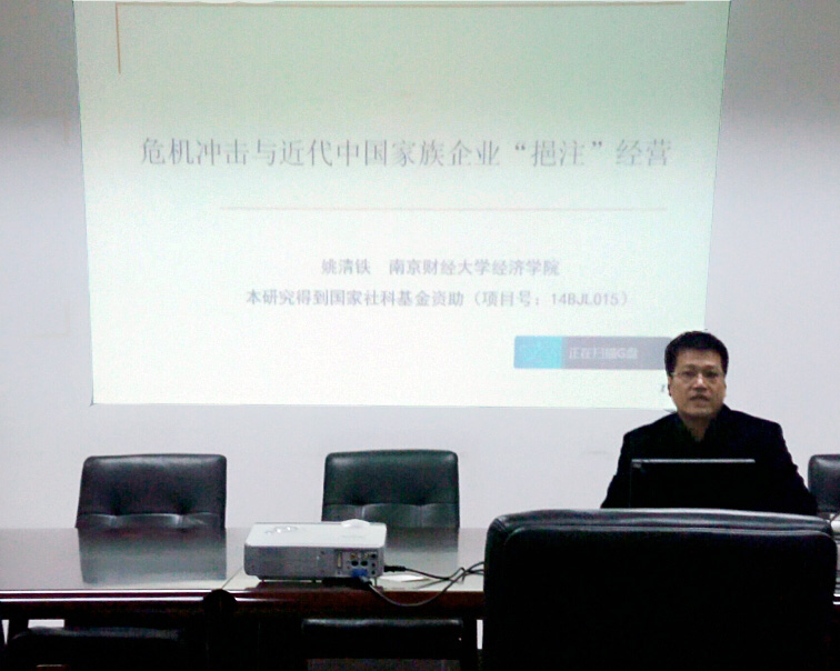 12月16日晚6点半,在经济学科楼307会议室,星空官网姚清铁博士为全校师生举行了一场题为《危机冲击与近代中国家族企业“挹注”经营》的学术报告,汇报了他正在主持的国家社科项目的阶段性研究成果。