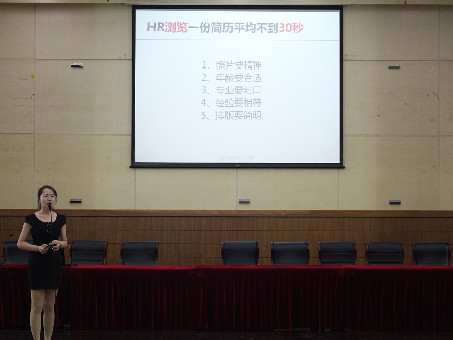 王静老师从HR如何筛选简历,如何制作优秀的简历,简历的设计和面试这四个方面进行了阐述。王老师首先强调了简历作为“敲门砖”的重要性,并以真实的故事和生动的语言分析了简历制作的要点:照片的选择,专业的对口和排版的要求等等。王老师也详细地介绍了简历制作的细节,提出制作简历的小技巧和小“心机”,用以提高简历的含金量,让简历与众不同。王老师还就面试前、面试时和面试后这三个时间段进行了讲解,提出在面试前要精心准备,面试时要灵活应对,面试后要持续关注,并主要介绍了面试着装的问题,就着装的风格,颜色和款式等问题给予具体指导;同时也强调了整个求职过程中的细节问题:如何让HR记住你,如何回复短信等进行了介绍。