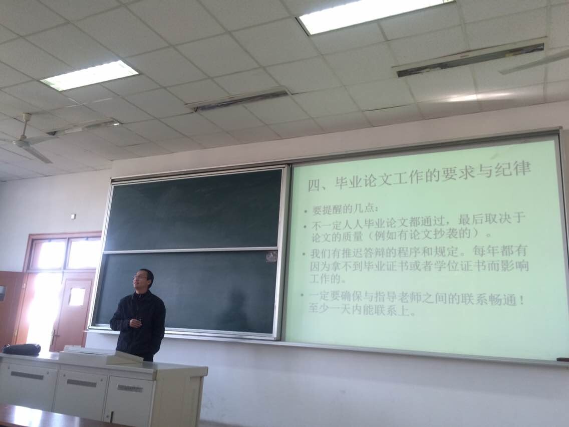叶院长首先就毕业生最重要的任务——找工作为切入点,深入浅出的剖析如何找到一份好工作,并希望大家从长远角度看待自己的第一份工作,然后引入今天的主题——如何写好毕业论文。他对本科生毕业论文的概念特征、学术论文的要求、毕业论文工作的要求与纪律、完成进度、毕业实习及其他一些问题进行重点介绍。使每一位毕业生都深入了解毕业论文写作的过程与注意点,并能端正态度,明确方向,以积极的状态完成大学阶段最后一份作业。