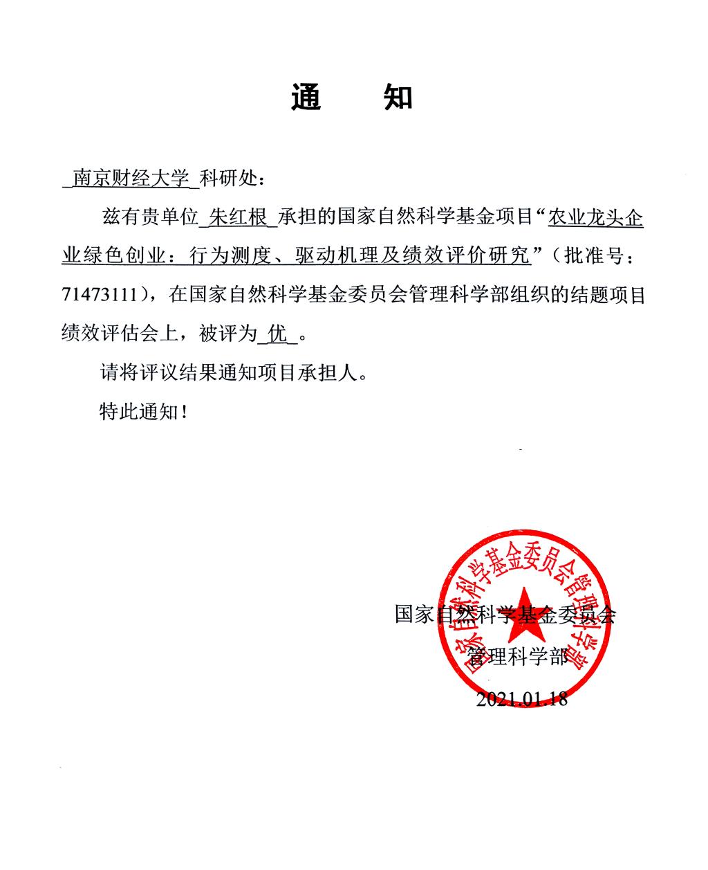 其中,星空官网朱红根教授主持的国家自然科学基金面上项目“农业龙头企业绿色创业:行为测度、驱动机理及绩效评价研究”(批准号:71473111),被评为“优”等级,这也是朱红根院长连续第3个国家自然科学基金项目结题绩效获得"优"等级。