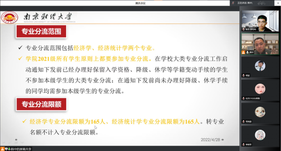 韩中副院长结合《XK星空体育2021级大类招生专业分流实施细则(南财经济字〔2022〕02号)》分别对大类招生专业分流和方向班选拔进行了系统的讲解,对专业分流范围、专业分流限额、专业分流志愿、专业分流流程、方向班报名及选拔进行了全面的介绍,重点解读了专业分流和方向班选拔的具体细则和流程。