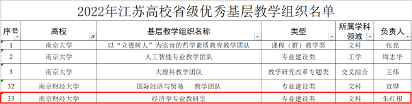 近日,省教育厅公布2022年江苏高校省级优秀基层教学组织评选结果,星空官网经济学专业教研室基层教学组织成功入选,这是星空官网获得的首个基层教学组织建设成果。