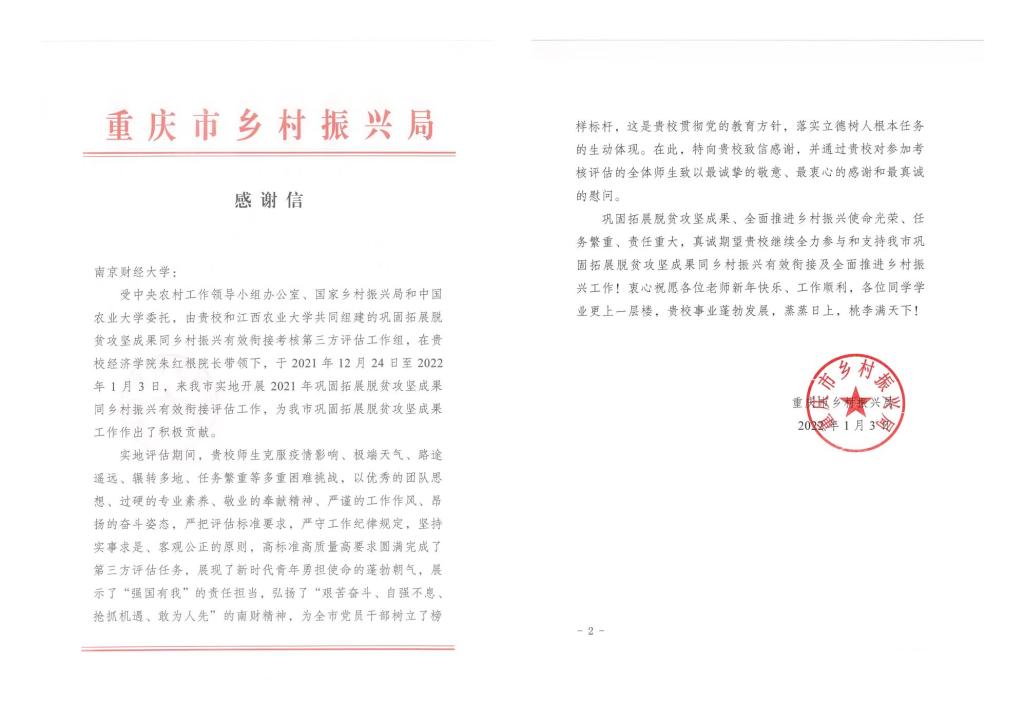 2021年,朱红根教授团队承担全国巩固拓展脱贫攻坚成果第三方评估任务后,学校党委高度重视,党委办公室、校长办公室,党委组织部,党委宣传部等部门和XK星空体育通力配合,确保评估工作顺利完成。评估期间,朱红根教授作为第三方评估组组长,带领团队克服疫情、极端天气等多重困难挑战,完成了4县抽查工作,调查涉及57个乡镇、79个行政村,开展座谈访谈187次,共计访谈324人,入户调查1645户农户。评估过程中严把评估标准要求、严守工作纪律规定,坚持实事求是、客观公正的原则,高标准高质量高要求圆满完成了第三方评估工作。评估工作得到了重庆市委、市政府的高度赞扬,并委托重庆市乡村振兴局专门给学校发来感谢信。