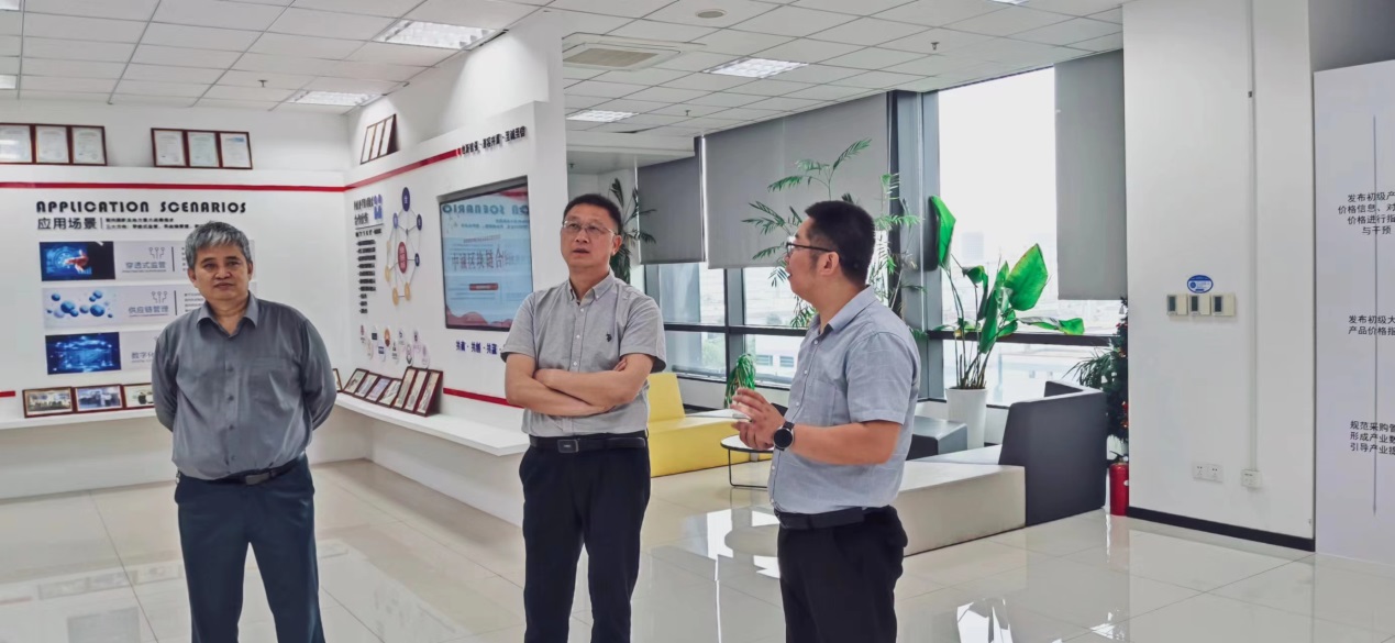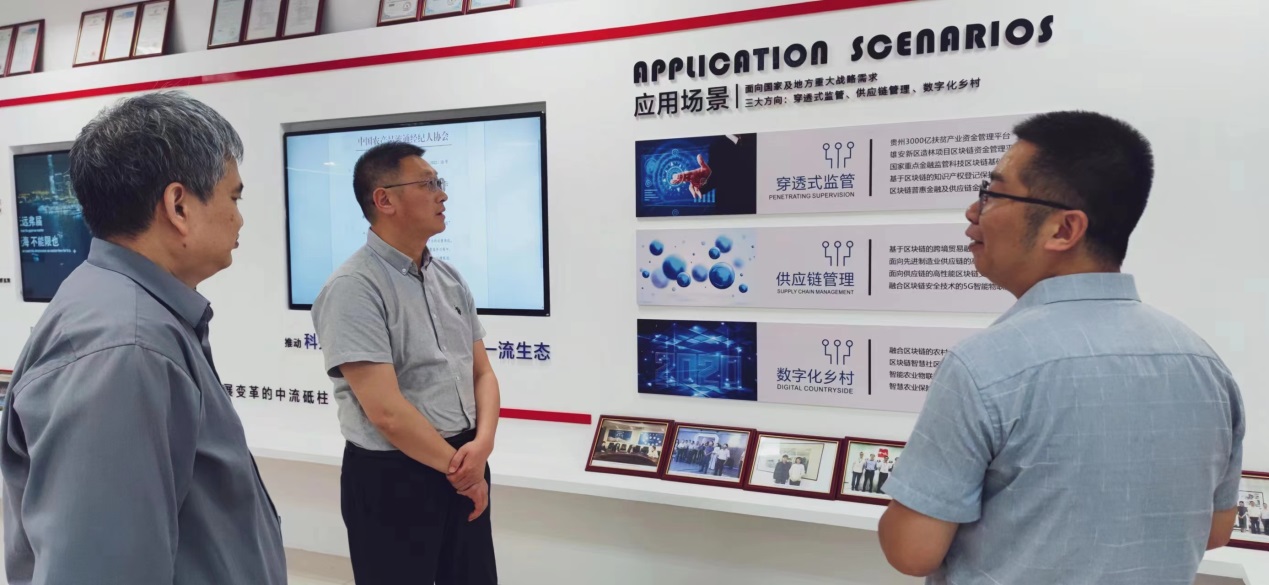 中诚区块链研究院汪洋总经理对星空官网领导的到来表示热烈欢迎,并带领朱红根院长一行参观了中诚区块链研究院(南京)有限公司展厅,详细介绍了中诚区块链研究院的发展背景、基本情况及在金融监管、数字农业方面的应用场景。