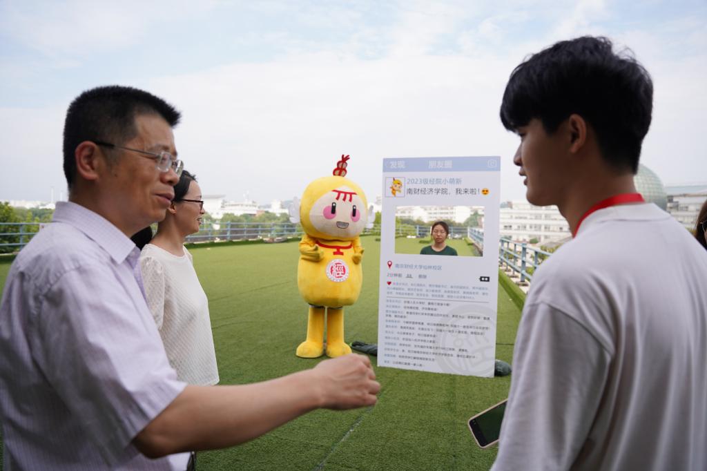 星空官网领导与新生及家长在写满学院领导老师点赞留言的朋友圈打卡框旁合影