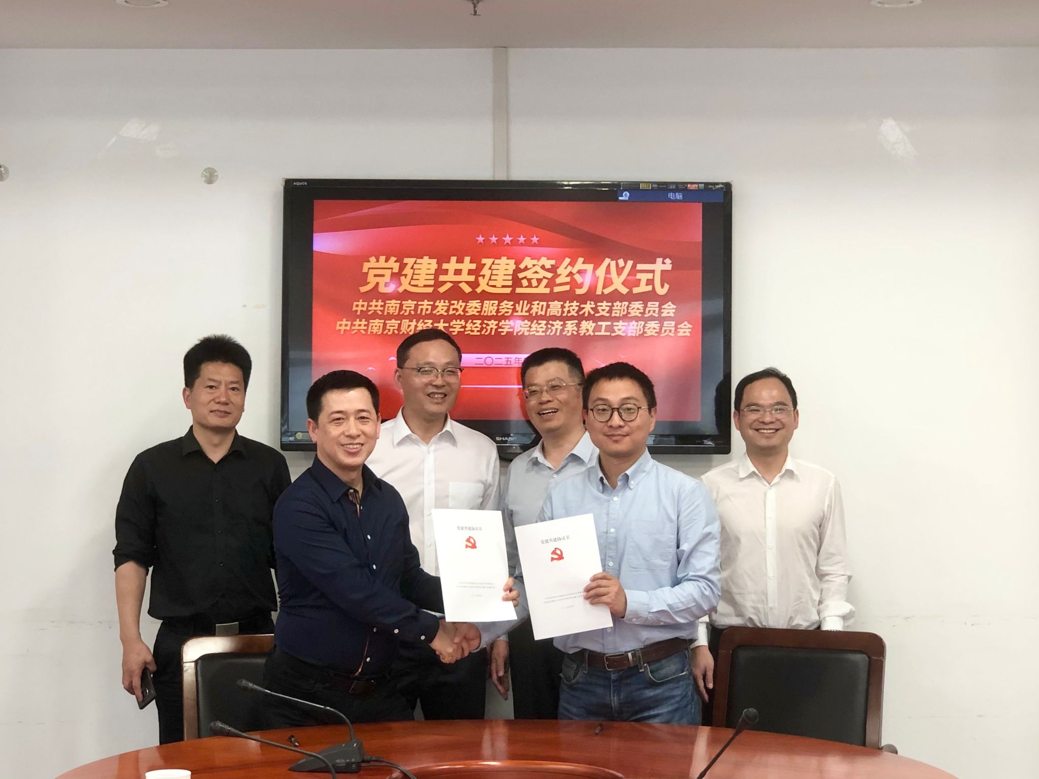 随后,中共南京市发改委服务业和高技术发展支部委员会书记胡耀与中共星空XKXK星空体育经济系教工支部委员会书记杨泳冰代表双方签订了结对共建协议,明确未来将在“政治理论联学、组织生活联过、特色品牌联创、招生就业联拓”四大领域深化合作,实现党建与业务“双融双促”,贾尚斌副主任、张圣兵书记、刘小峰副院长等在场人员见证了这一时刻。