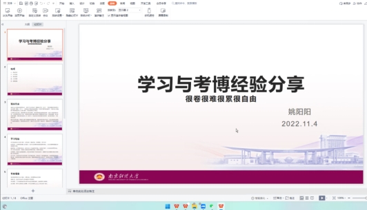 姚阳阳同学分别从现实约束、学习经验、考前准备、心态调整及前景展望这个五部分向同学们进行学习和考博经验分享。他指出,在目前失业率前景不乐观的前提下,考博呈现出越来越卷、越来越难的趋势,因此在报考时应做好充分准备,主要通过查看公告、查找真题与论文准备这三部分进行考前准备。同时,姚阳阳同学还建议同学们要高效利用碎片化时间来浏览期刊文献,精读自身领域的前沿文献,要充分利用好自己的时间,勤做记录,面对很卷、很累及很难的大局势,要积极调整好个人心态。