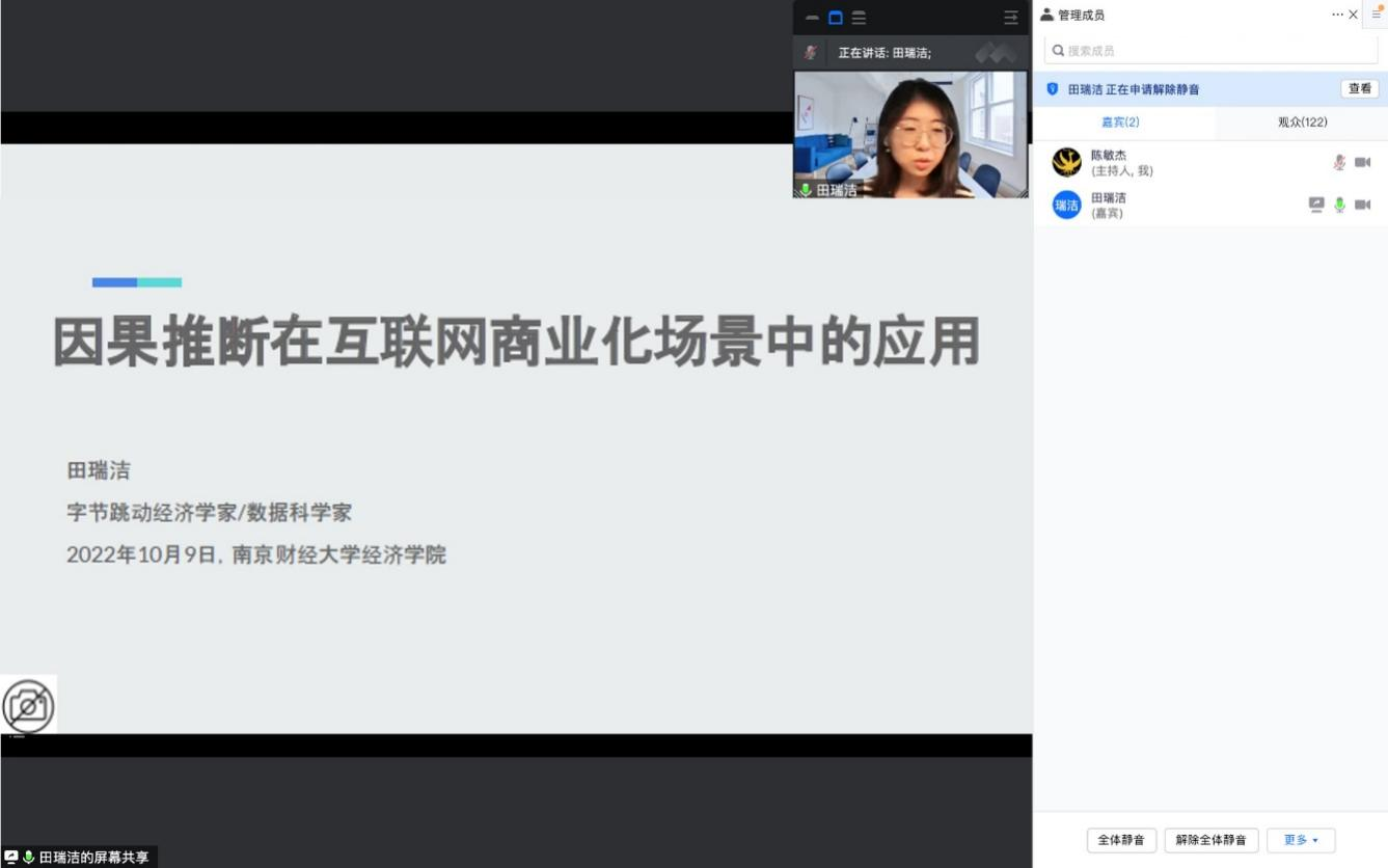 10月9日上午,北京字节跳动科技有限公司的经济学家/数据科学家田瑞洁博士受邀为星空官网师生作了题为《因果推断在互联网商业化场景中的应用》的讲座报告。星空官网青年教师陈敏杰博士主持了本次讲座活动。XK星空体育师生积极参与,报告还吸引了部分校外师生及相关行业的专业人员参与。