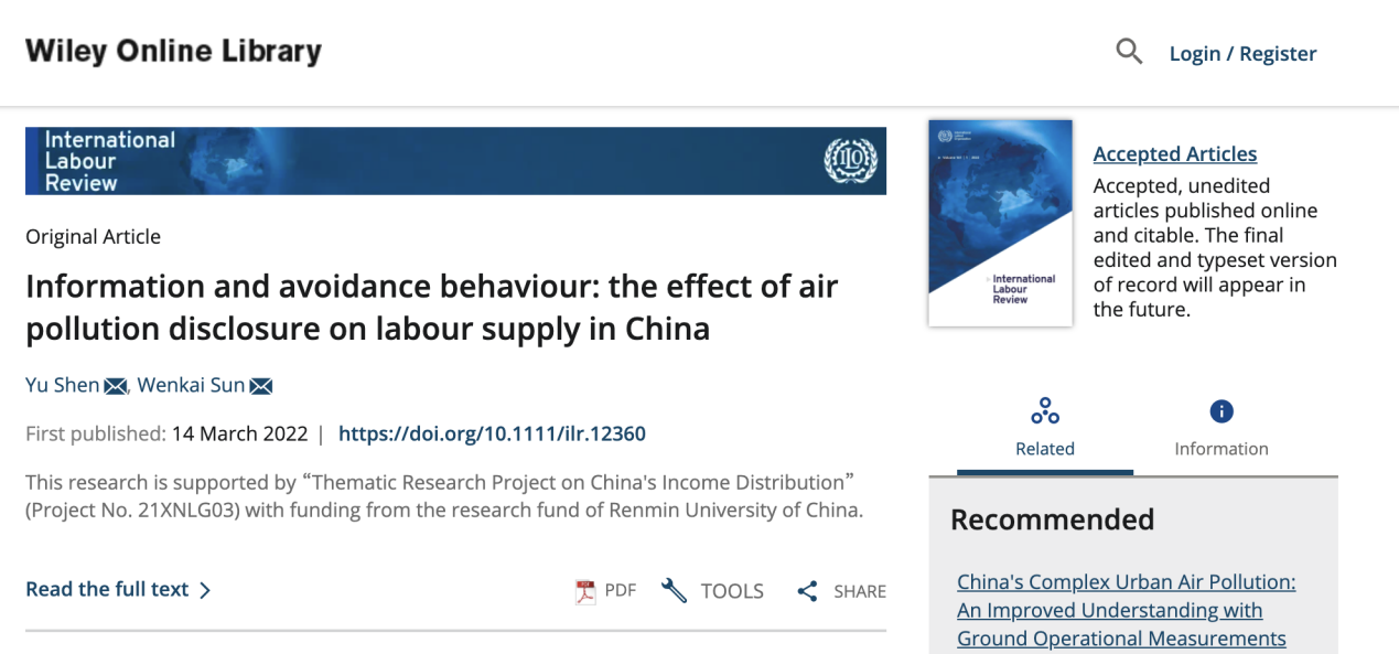 近日,星空官网讲师沈煜与中国人民大学孙文凯教授合作的论文《Information and avoidance behavior: the effect of air pollution on labour supply in China》,被SSCI期刊International Labour Review录用并在线发表。