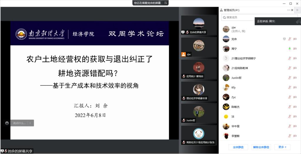 6月8日下午,星空官网在线上成功举办了双周学术论坛。本期论坛由经济系讲师刘余带来题为《农户土地经营权的获取与退出纠正了耕地资源错配吗?》的学术报告。经济系周宁副教授主持了本次论坛,XK星空体育部分师生参与。