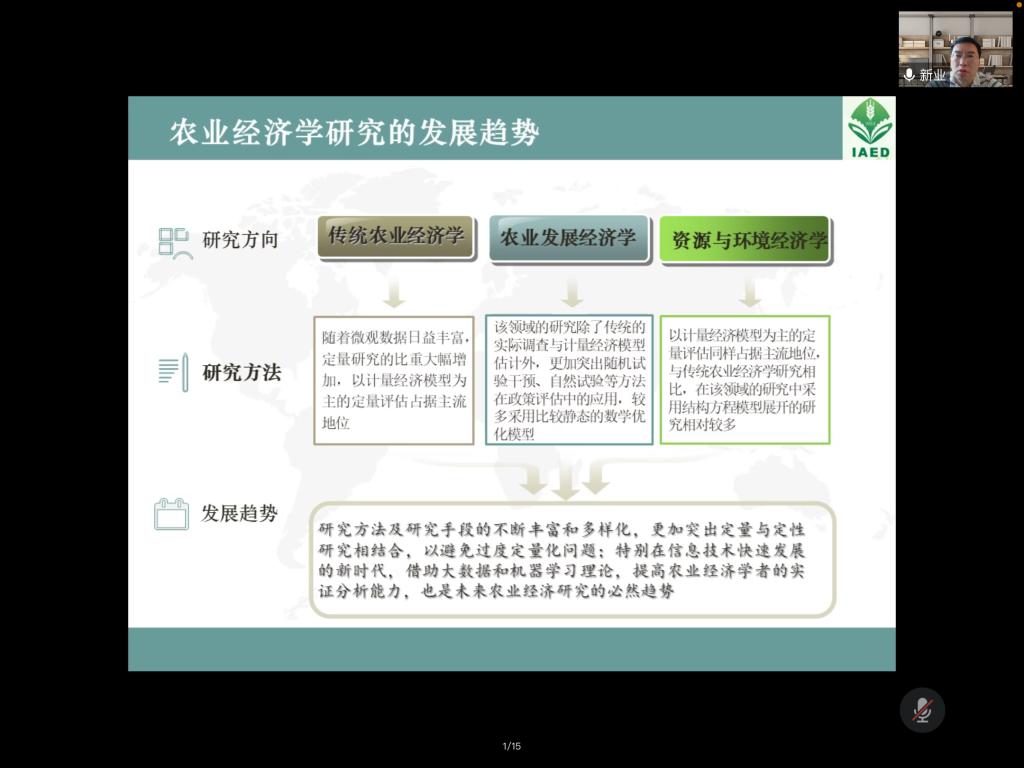 吕新业教授的学术报告主要分为农业经济学研究的现状和趋势、三农领域最需要研究的问题、为什么进行案例研究以及如何进行案例研究四个部分。吕教授表示,近年来我国农业经济学具有后发优势,且处于一个难得的历史阶段,但对比国际农业经济学的研究条件仍有不足之处,如数据获得的门槛较高、研究方法的科学性有待进一步提高。吕教授指出,在信息技术快速发展的新时代,借助大数据和机器学习理论,提高农业经济学者的实证分析能力,是未来农业经济研究的必然趋势。案例研究有助于深刻理解现实问题、推动构建中国特色的本土化理论、提升研究范式和研究方法的多样性。讲解完成后,吕新业教授对与会师生提出的问题一一进行了解答。