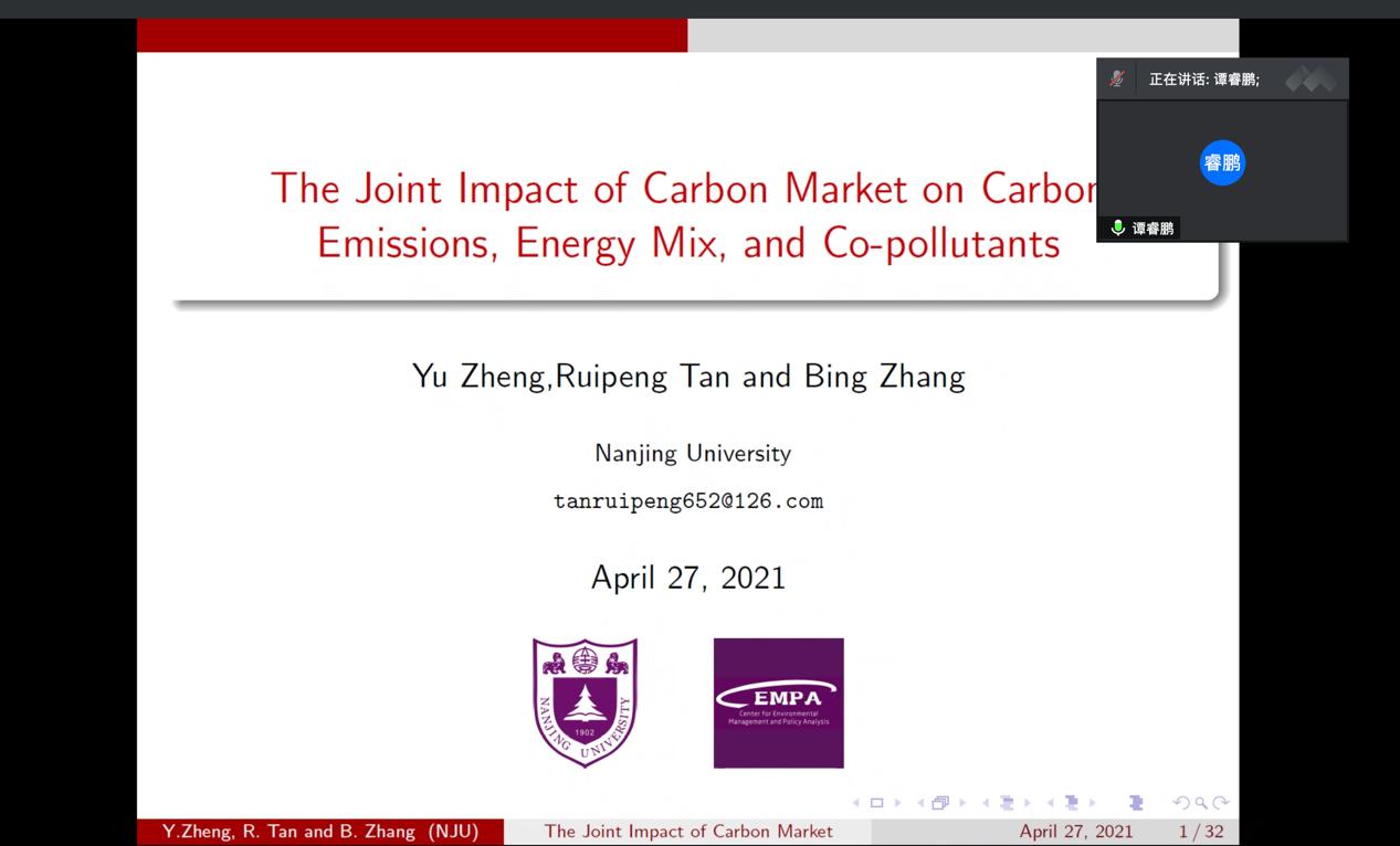 4月27日下午,南京大学环境学院谭睿鹏老师,在腾讯会议为星空官网师生带来《The Joint Impact of Carbon Market on Carbon Emissions, Energy Mix, and Co-pollutants》的专题学术讲座。