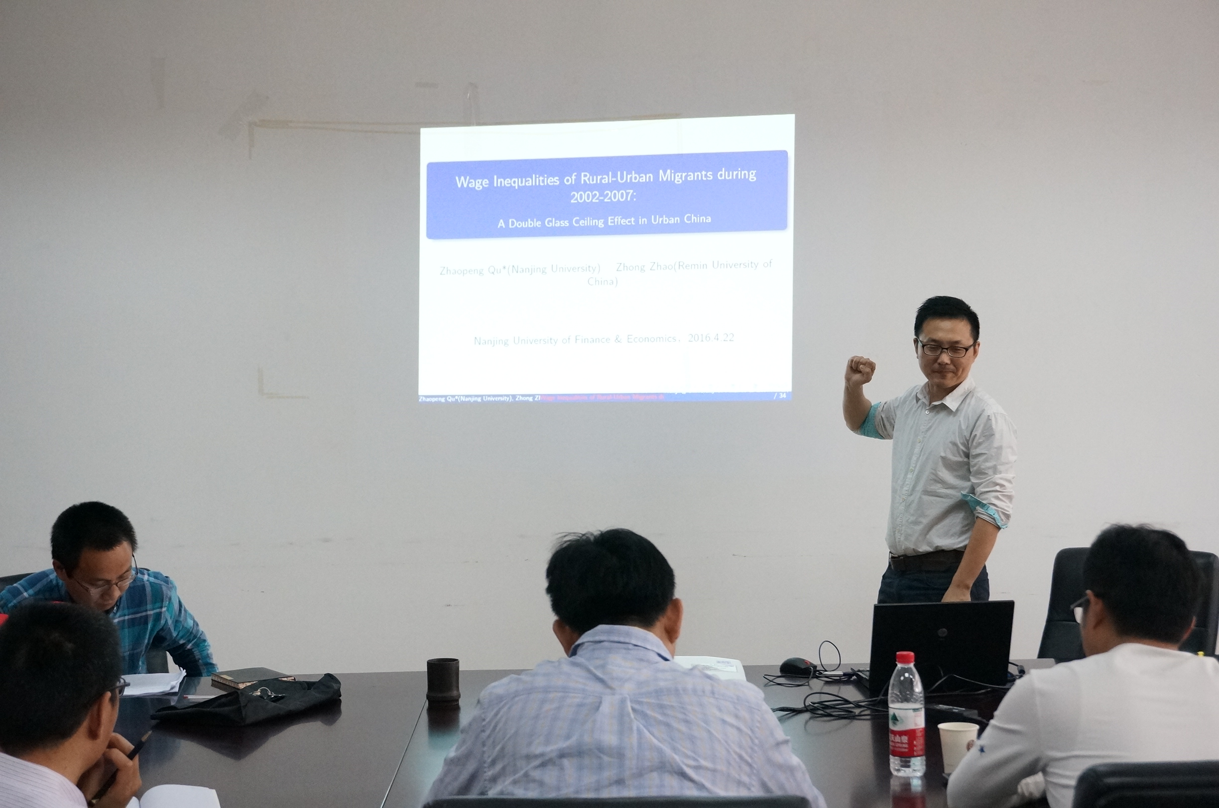 4月22日下午2点,XK星空体育“长三角收入分配与经济增长”学术论坛迎来第6次报告,本次主讲人为南京大学的曲兆鹏老师,他为大家带来的精彩报告是——“Glass Ceiling in Urban China: Wage Inequality among Rural-Urban Migrants during 2002-2007”。XK星空体育部分教师和研究生参加了本次学术活动,讲座由XK星空体育叶林祥老师主持。