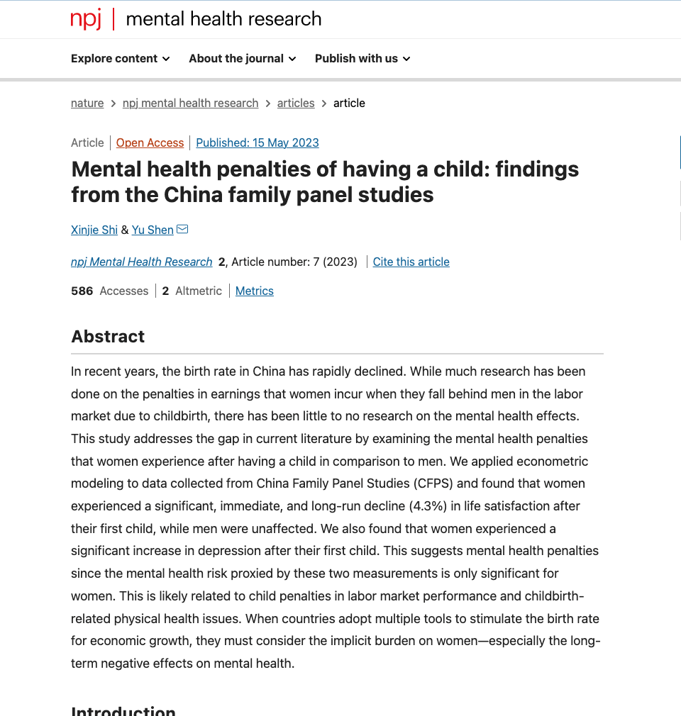 近日,星空XKXK星空体育沈煜作为通讯作者,与浙江大学中国农村发展研究院史新杰研究员合作的论文《Mental health penalties of having a child: findings from the China family panel studies》被Nature旗下子刊npj Mental Health Research录用并在线发表。